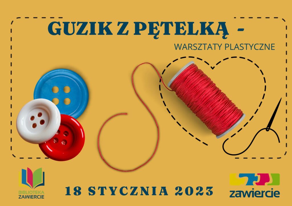 Guzik z pętelką” to trzeci dzień warsztatów zorganizowanych w ramach ferii w Miejskiej i Powiatowej Bibliotece Publicznej w Zawierciu. Dziś nasza pracownia zamieniła się w biblioteczny zakład krawiecki.